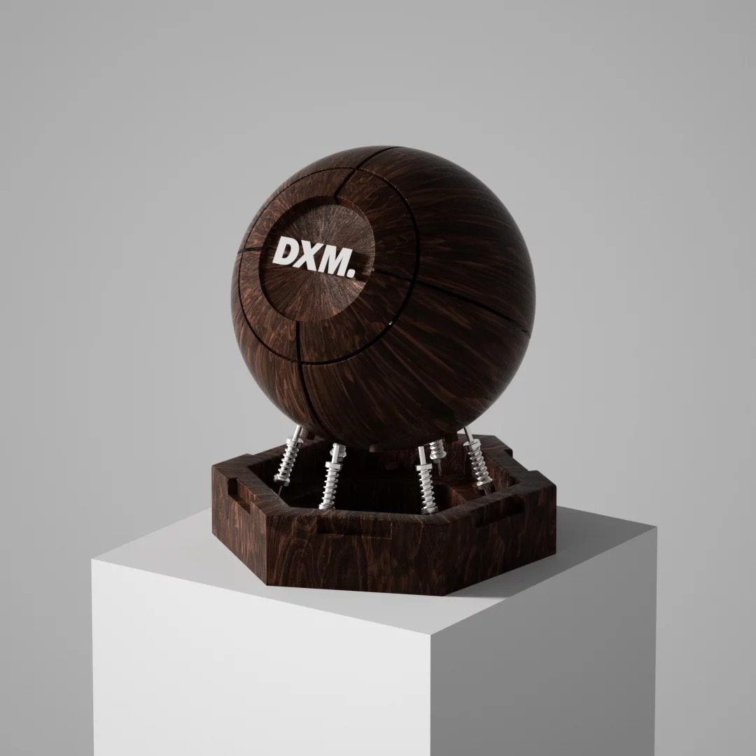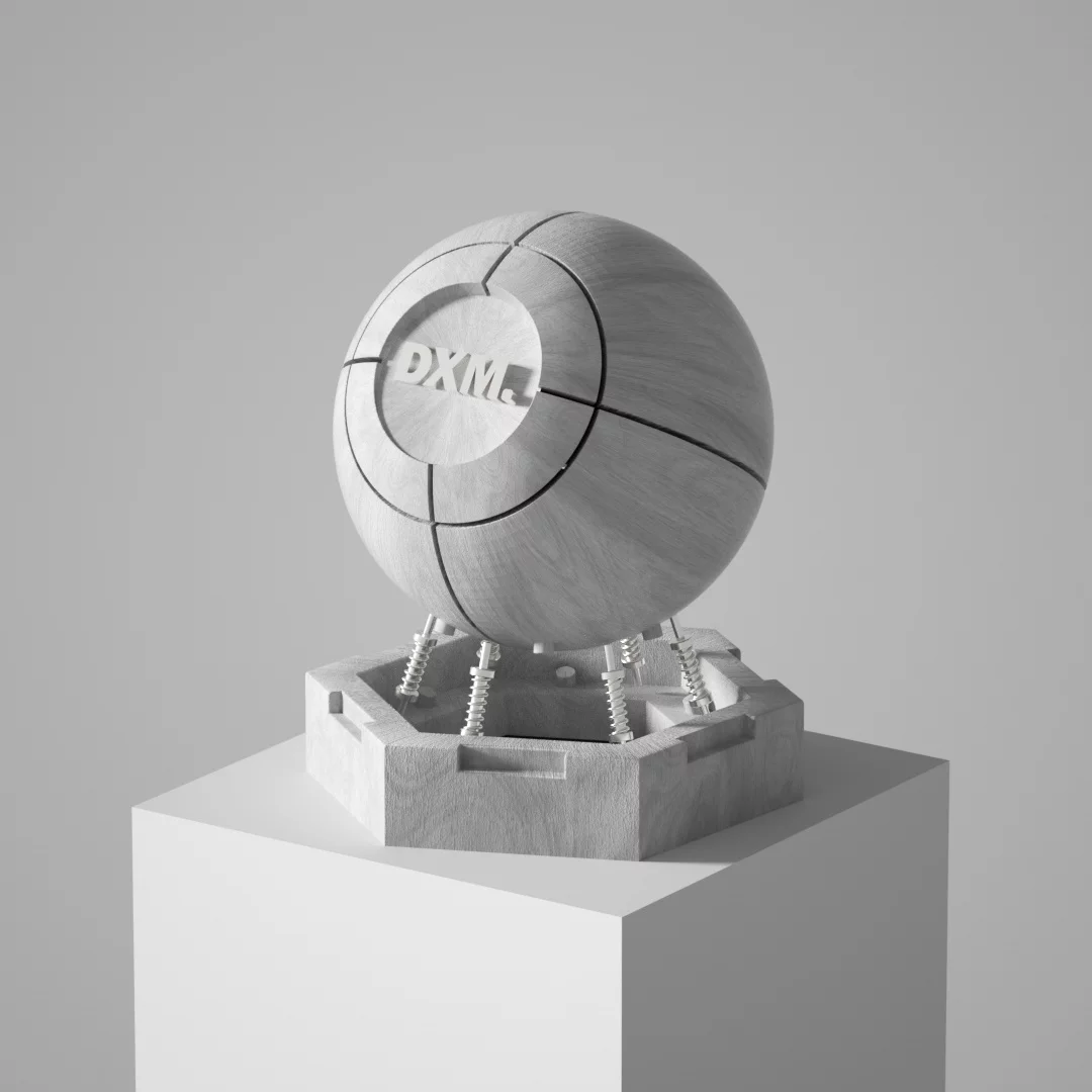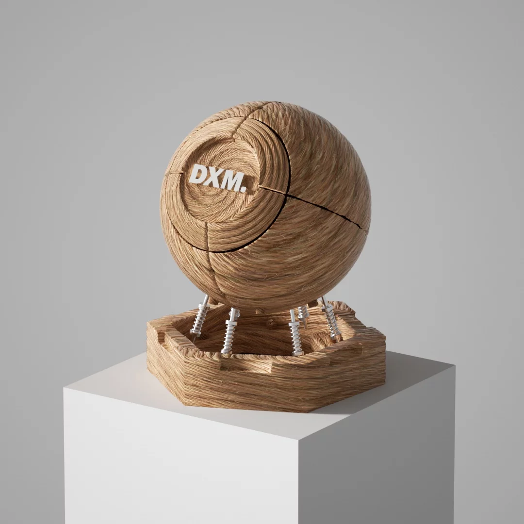 A variety of simple and textured light hemp rope weaving textures, the overall shape is a sphere, and the surface is composed of dense spiral winding textures, as if it is hand-coiled by natural fibers, showing the beauty of the original and organic material. The front of the sphere is embedded with a circular area embedded with a white \"DXM.\" The lettering, with its simple and powerful font, contrasts with the rough hemp rope background and reinforces the visual focus of the brand identity. The bottom of the sphere is connected to the hexagonal base by five silver metal springs, which not only provide support, but also give the overall design a modern industrial aesthetic of \"suspension\" and \"mechanical tension\". The base is also made of hemp rope woven material consistent with the sphere, and the edges are polygonally cut, which echoes the roundness of the sphere geometrically, and the internal hollow structure is faintly visible, enhancing the depth of space and structural layer.