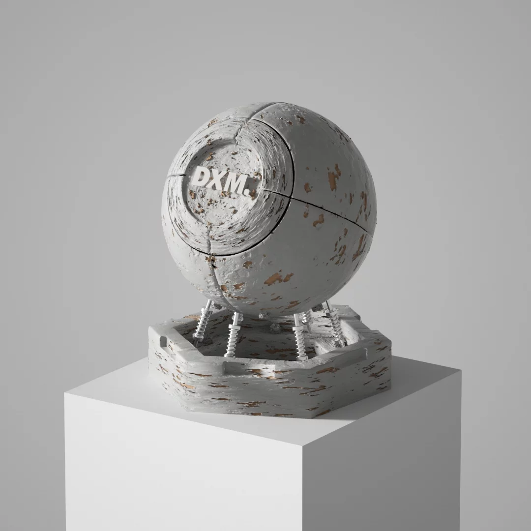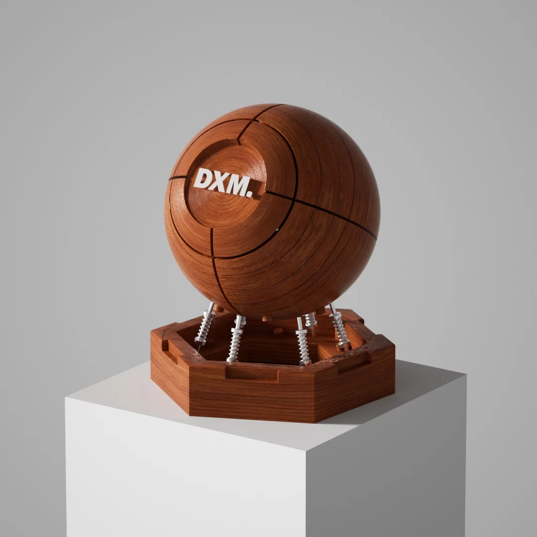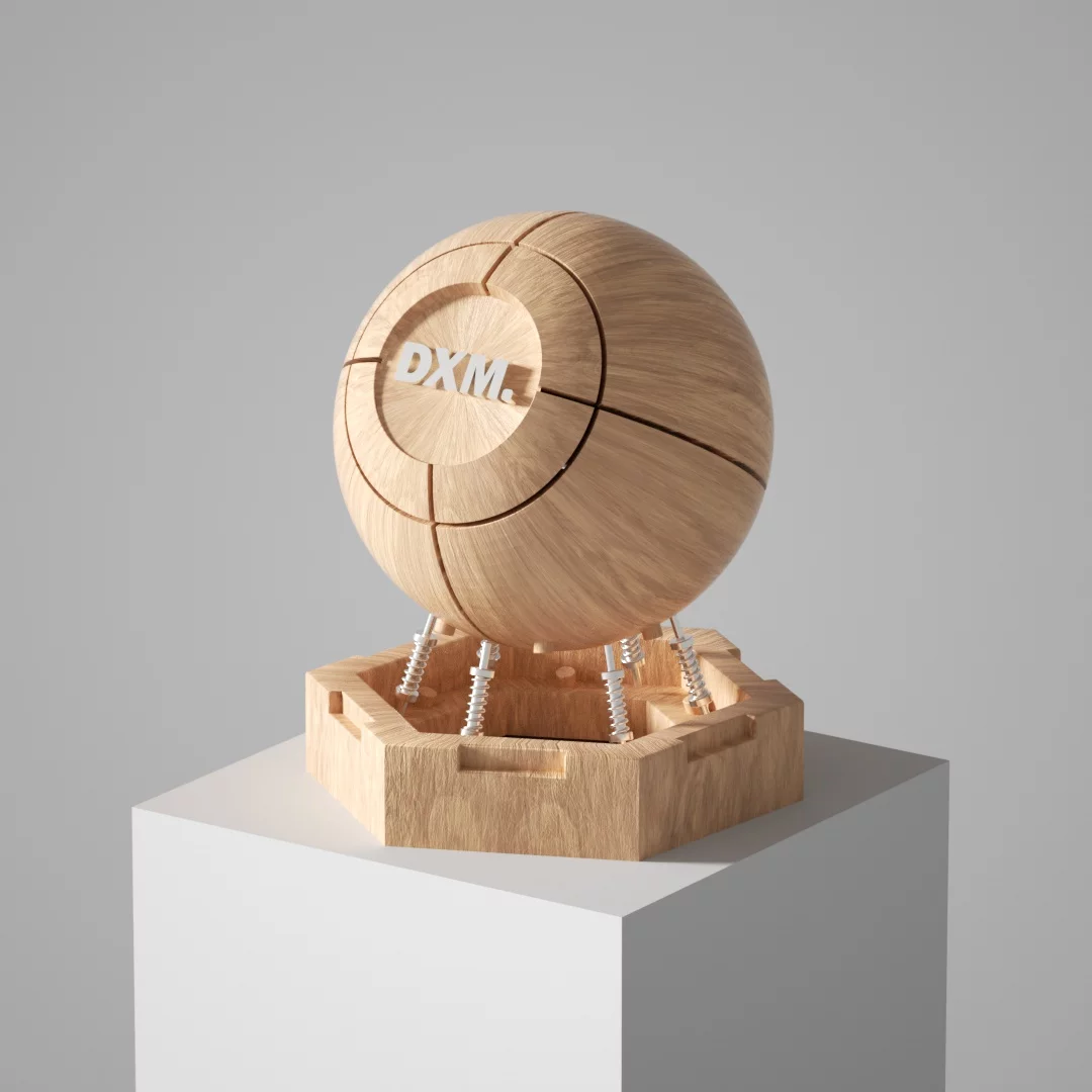 A variety of simple and textured light hemp rope weaving textures, the overall shape is a sphere, and the surface is composed of dense spiral winding textures, as if it is hand-coiled by natural fibers, showing the beauty of the original and organic material. The front of the sphere is embedded with a circular area embedded with a white \"DXM.\" The lettering, with its simple and powerful font, contrasts with the rough hemp rope background and reinforces the visual focus of the brand identity. The bottom of the sphere is connected to the hexagonal base by five silver metal springs, which not only provide support, but also give the overall design a modern industrial aesthetic of \"suspension\" and \"mechanical tension\". The base is also made of hemp rope woven material consistent with the sphere, and the edges are polygonally cut, which echoes the roundness of the sphere geometrically, and the internal hollow structure is faintly visible, enhancing the depth of space and structural layer.
